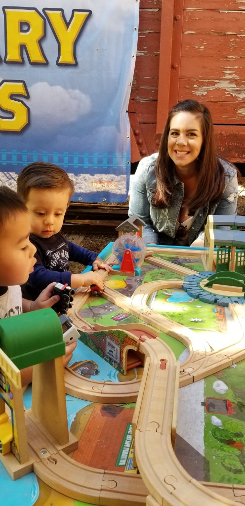 At the station, the fair-like atmosphere offered fun for kids of all ages. We opted to start by walking through the old caboose cars. There were three of them, and they each had a themed activity. The first was the Story-Telling Caboose, where people could relax indoors and watch Thomas the Train videos and/or read books. Jameson adores books, so we stayed and read the over-sized Thomas books for a few minutes. This is also where we were given a Passport to Adventures (also known as a Passport to Friendship) that encouraged us to visit four specific locations at the event, collect four stamps, and consequently collect a special prize (the prize is a secret, so you’ll have to find out what it is for yourselves). The second car was the Tattoo Caboose, where kids could get temporary Thomas tattoos. There were a number of children in line for a tattoo, so we passed on this opportunity. The third was the Coloring Caboose, where kids could color their own Thomas & Friends coloring pages. Jameson is only starting to appreciate crayons, so he scribbled for a bit, but he seemed more interested in watching older kids work on their pages instead of coloring himself.