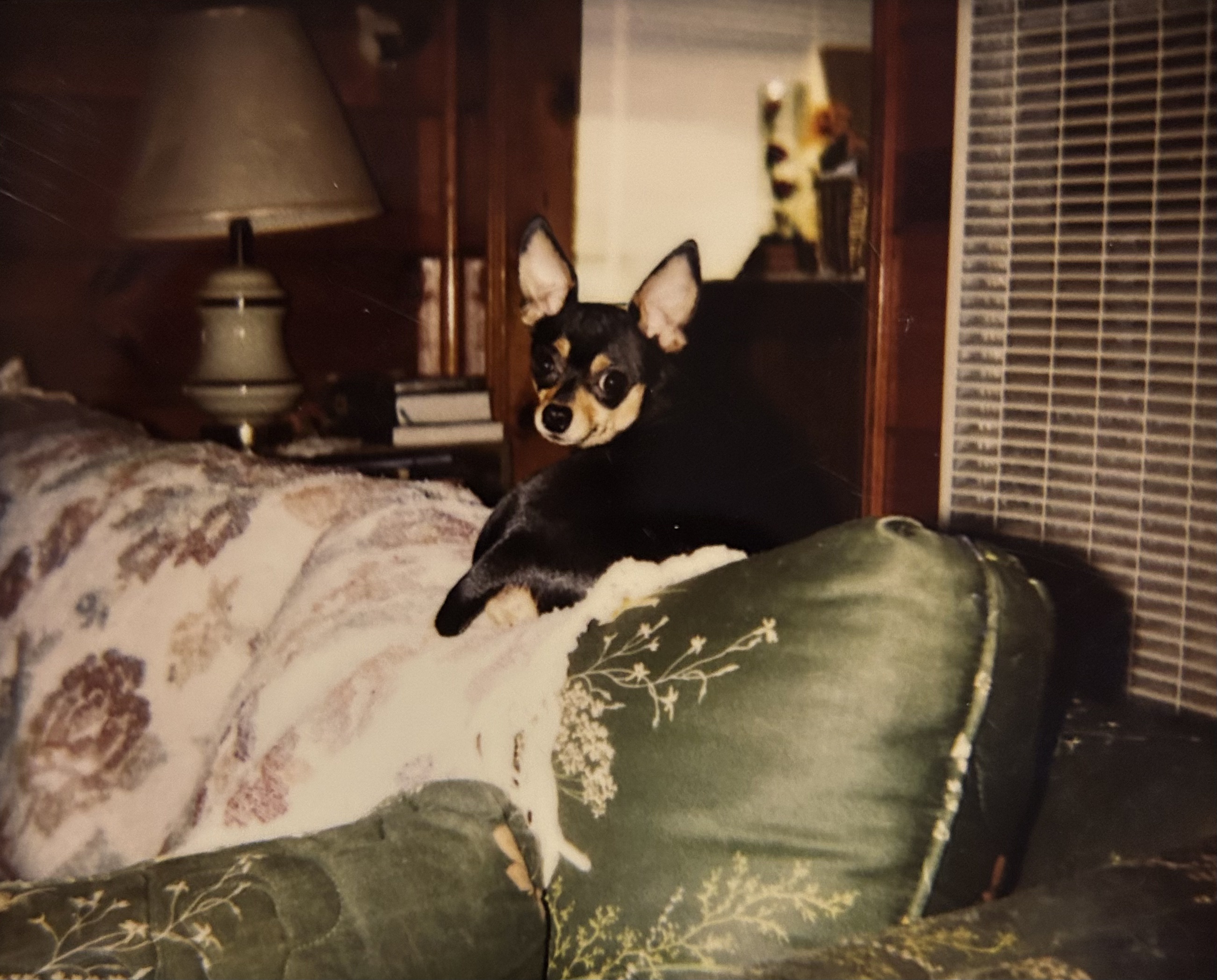 I don’t have any photos of my mom or me in that old cabin, but I do have two old photos of my mom’s beloved chihuahua, Lucas, and our old cat, Booger. Lucas can be seen sitting on the old couch we eventually got in the living room. It allowed my mom to no longer need to sleep on the floor. Booger and Lucas can also be seen in my bedroom loft, just in front of my floor mattress; the same one I use to lie on looking out that small window. These two pictures don’t tell the story of poverty I relayed above, but that couch and that mattress, along with a small table in the kitchen, were pretty much the only furniture we ever had in that place. Some may call it simple living; I called it poverty. At least Lucas and Booger never knew how hard those winters in the damn cabin really were.